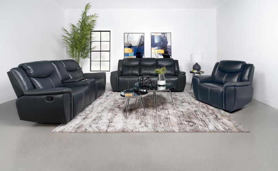 Sloane Upholstered Motion Reclining Sofa with Drop Down Table Blue