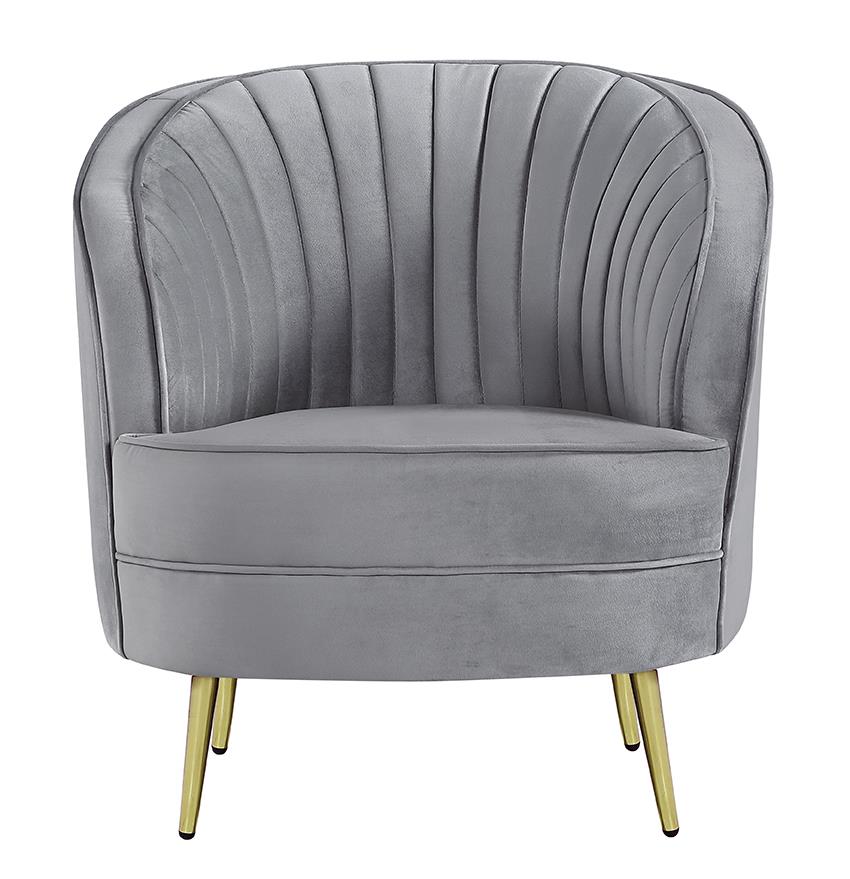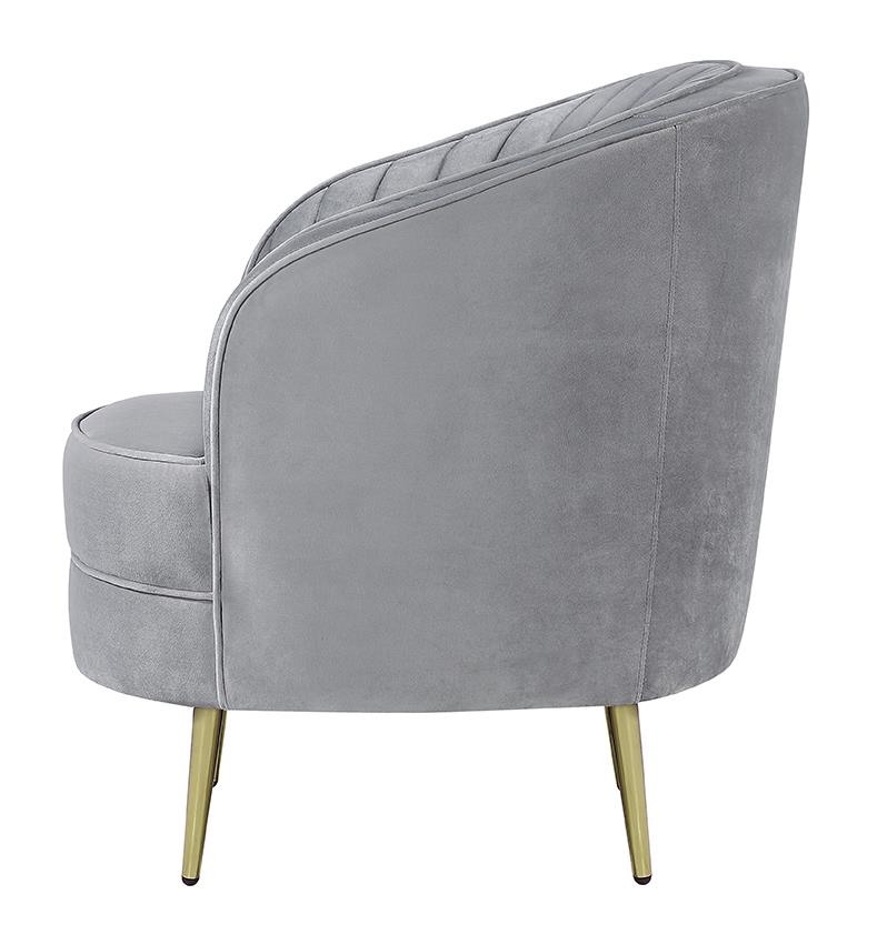 Set the stage with this contemporary chair, wrapped in a vivid blue velvet (gray velvet)all around. Perfect for a contemporary seating living room or a bedroom seating area, this blue accent chair invites you to unwind between enveloping arms and a channel tufted interior upholstery. Elevated by steel tapered legs in a warm gold finish, this club chair makes itself at home while being the life of the party. With this super chic and stylish Art Deco-inspired chair, you can accent a boring corner of a room. Alternatively, you can create an entire ensemble with a matching loveseat and sofa.