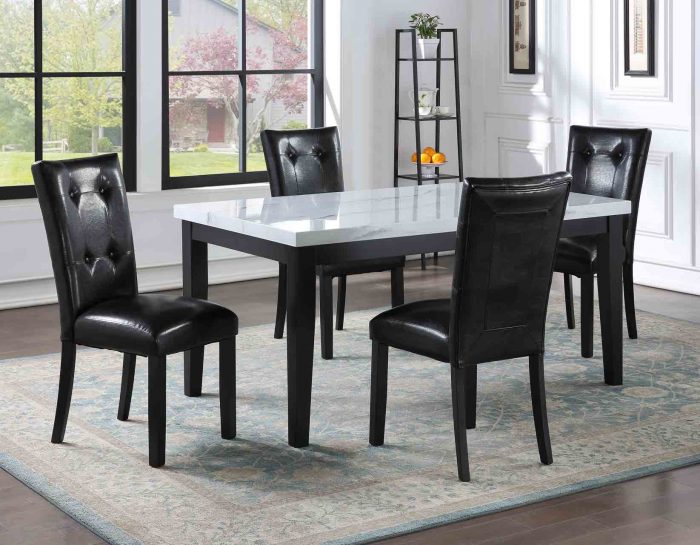 Elegant dining with Sterling faux-marble top. A rich cordovan cherry finish pairs beautifully with a white faux-marble top for dining at its finest. Pair with the lovely tufted back, easy-care faux-leather chair.