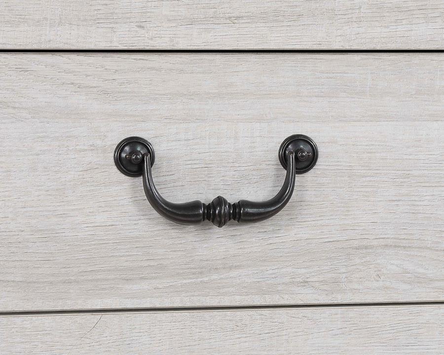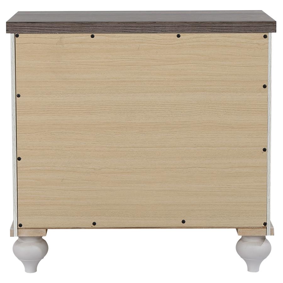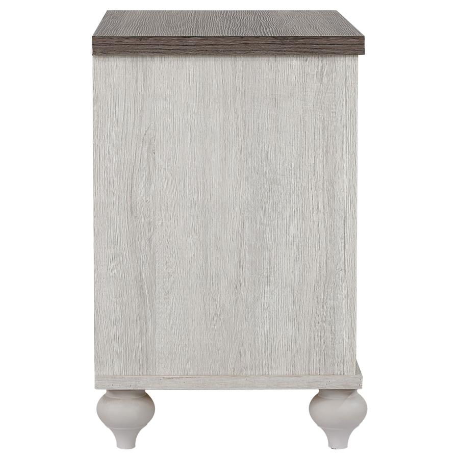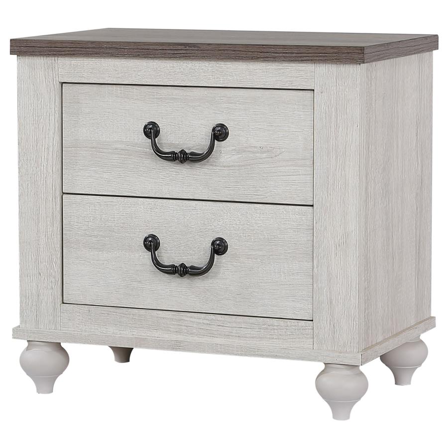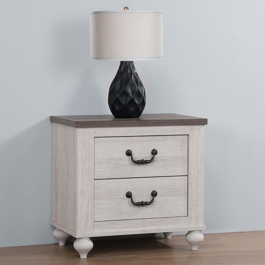 A striking two-tone transitional two-drawer nightstand brings a warm, inviting presence to your home. It features a classic design with appealing tones and features that fit any home with transitional or traditional decor. The rectangular tabletop comes in an ash brown finish that's a handsome contrast to the charming vintage linen finish. The drawers are adorned with bail drop-down handles in a matte antique bronze finish that brings out the wood grain details of the finish. Delicate bun feet complete the design of this fabulous accent piece with rustic touches.