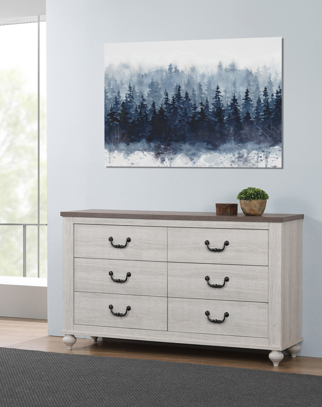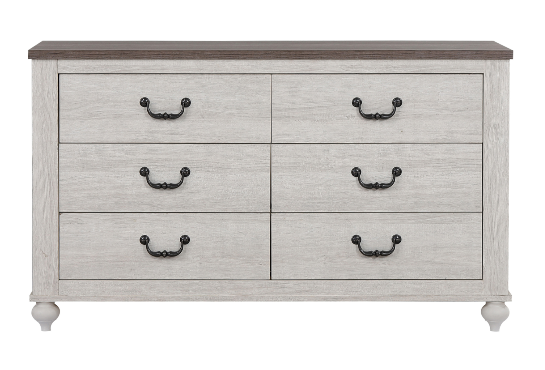 This two-tone transitional six-drawer dresser casts a warm, charming presence in your bedroom. It features a classic design with delightful tones and features that fit any transitional or traditional home. The rectangular tabletop is fashioned with an ash brown finish, a handsome contrast to the charming vintage linen finish. Each drawer is adorned with bail drop-down handles in a rich matte antique bronze finish that brings out the wood grain details of the finish. It sits on delicate bun feet to complete the design of this fabulous rustic-inspired accent piece.