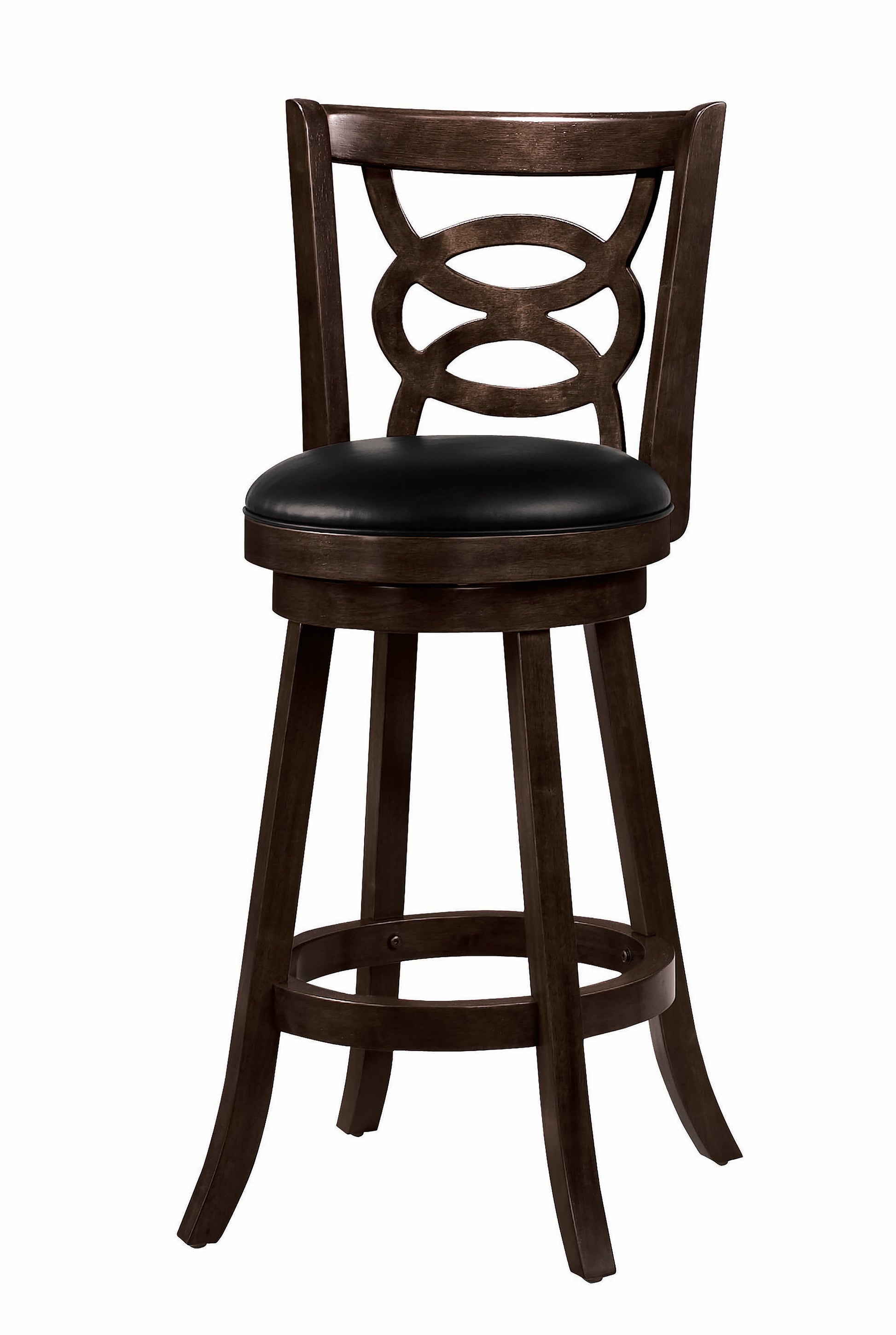 This stylish bar stool adds a touch of casual sophistication to your home bar. The angled legs and round brace offer sturdy support while you catch up on the news. The merlot wood finish is warm and inviting as you settle in for the evening with a glass of wine. The padded seat is upholstered in black leatherette and swivels so you're ready for conversation at any turn. To top it off, the unique backrest has a can't-miss design that's sure to please.