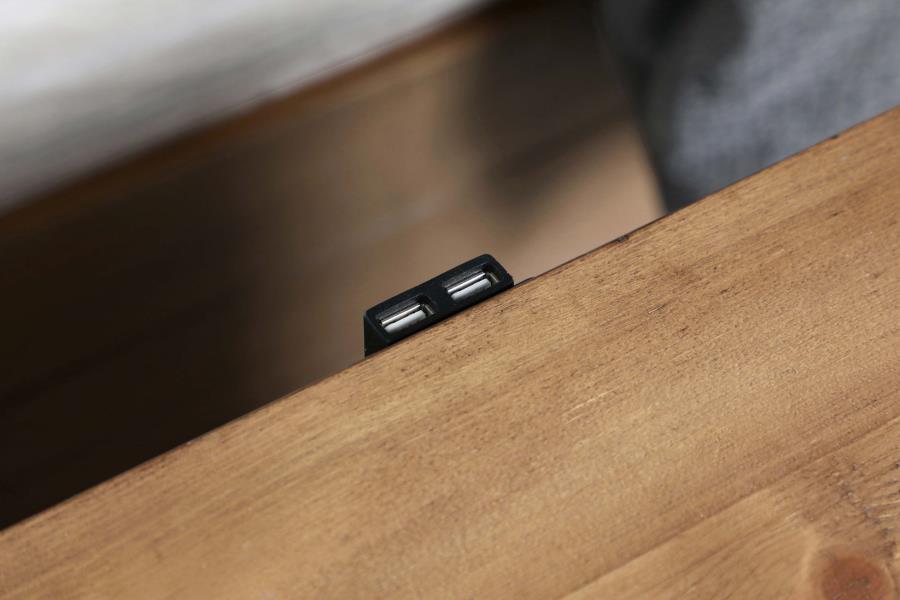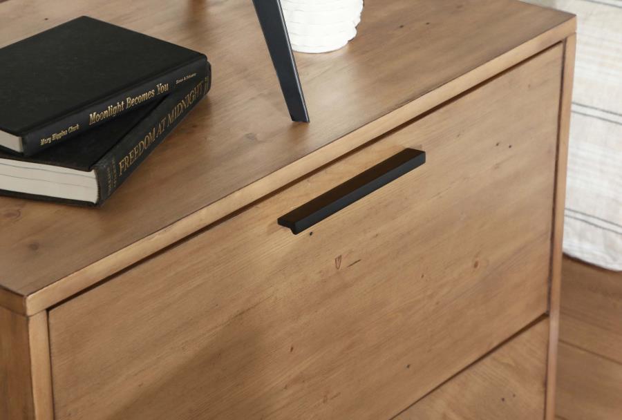 Elevate your modern bedroom with this contemporary two-drawer nightstand, designed in a neutral light honey brown finish and accented with bold matte gunmetal angled legs and slim drawer pulls. Thoughtful details like a soft felt-lined top drawer, cedar bottom drawer, and a built-in USB outlet complete this sophisticated modern nightstand.