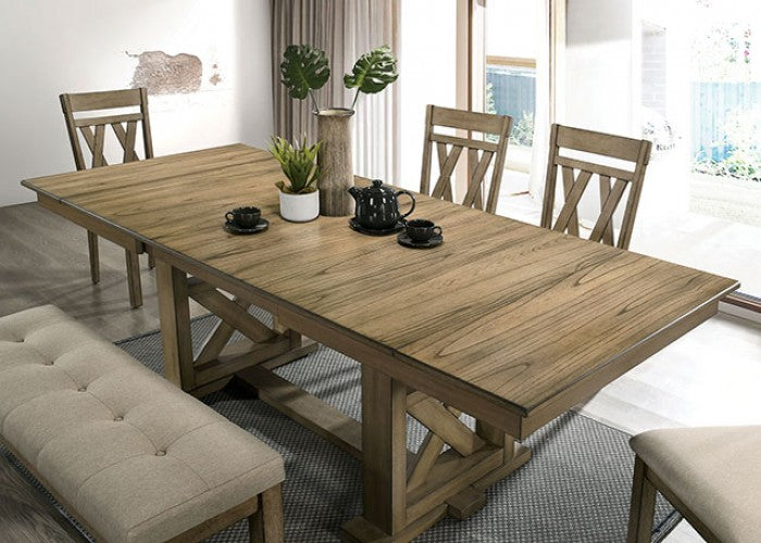 With the ability to expand the table top with two leaves, there is room for everyone in this table. Conveniently, the leaves on both ends retract easily when not in need, making this a versatile piece for any home. The style is of course unmistakably farmhouse--the trestle base and the chair backs both have the classic cross back design. The set might be big in stature as a while, but the lighter shade of brown coupled with the beige cushions gives it a hint of delicateness that serves only to enhance its overall appeal.
