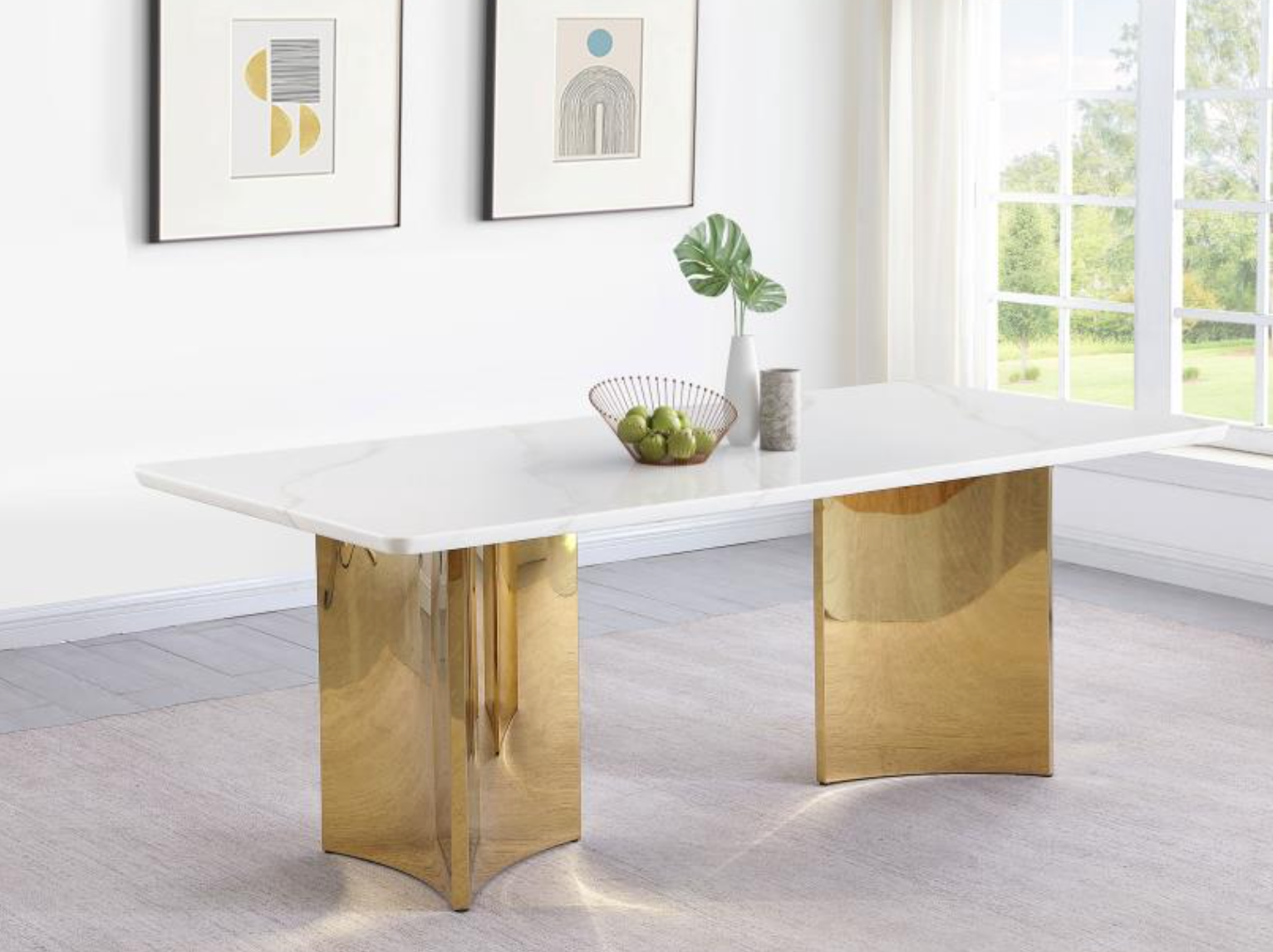 instill a sense of luxury with this striking contemporary dining table, featuring a genuine white marble table top. The rectangular table, constructed with engineered marble veneer, china white marble, and MDF, comfortably seats friends and family, offering a fresh, modern look. Brimming with elegance, the table showcases the white marble to perfection, allowing its natural veining to create a rich, refined character. Adding a touch of glamour, the table is supported by a double pedestal base, each pedestal being a curvy, three-sided structure made of champagne gold stainless steel. This stunner is an exceptional focal point in any sophisticated dining room. | |