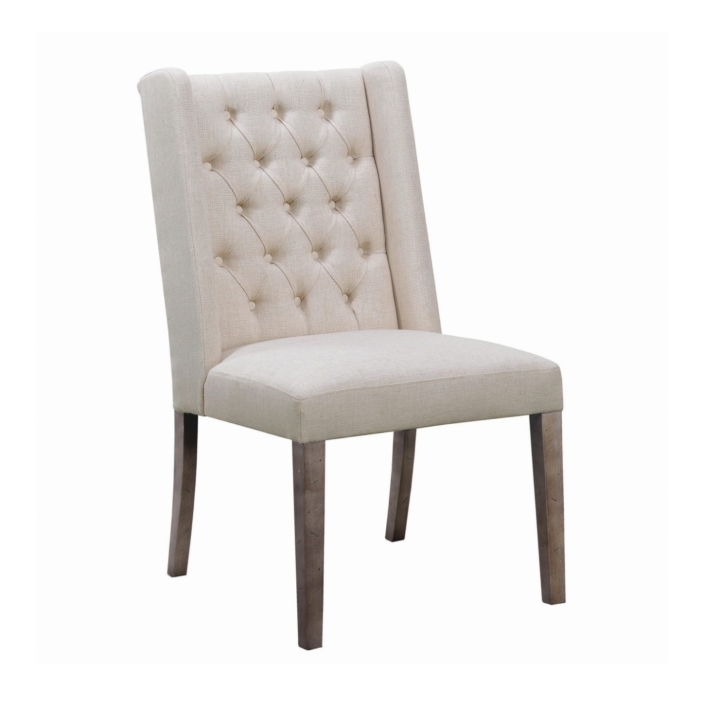 - Demi-wing chairs feature foam padded cushioning in beige linen-like fabric upholstery with button tufting and dark brown legs