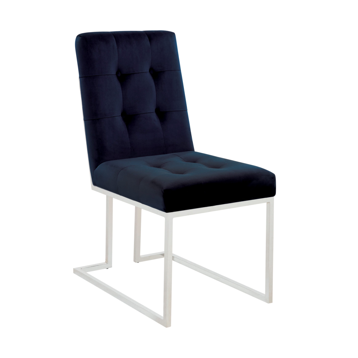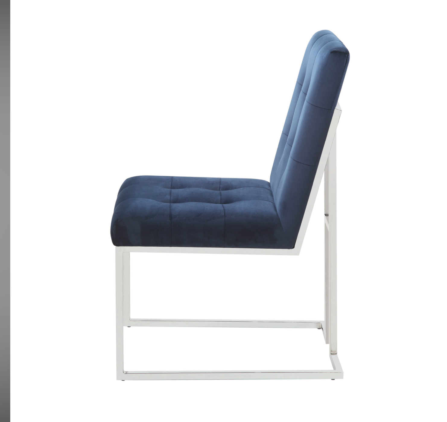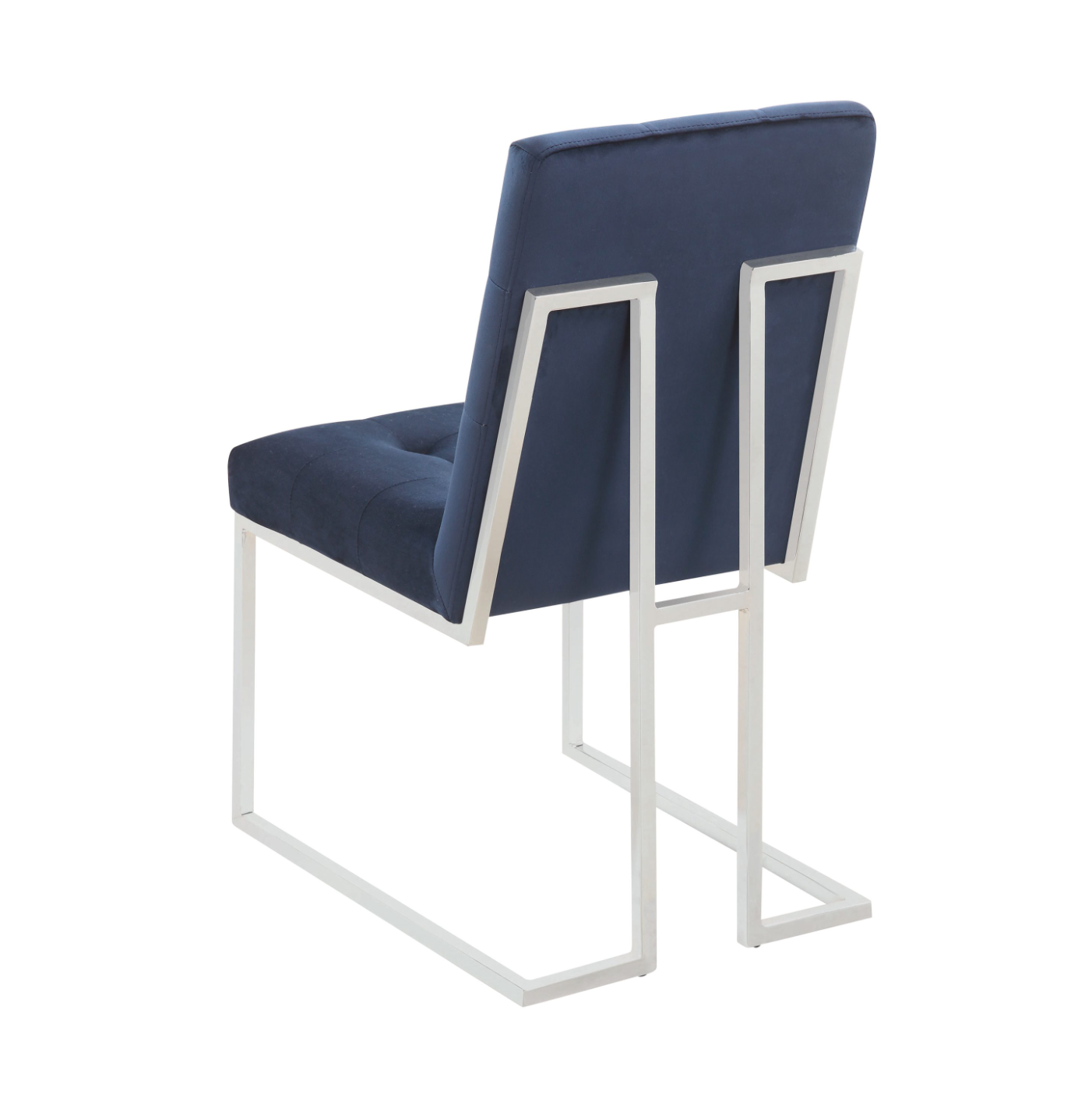 Create a stunning visual with the bold colors from this armless dining chair. Open up a dining room with sleek and metallic chrome legs. The blue cushioned back and seat is filled with button tufting for an elegant look. Bold colors and angles meet to create a luxurious piece that adds style and comfort. Luxury and practicality marry for a sensational piece of decor.
