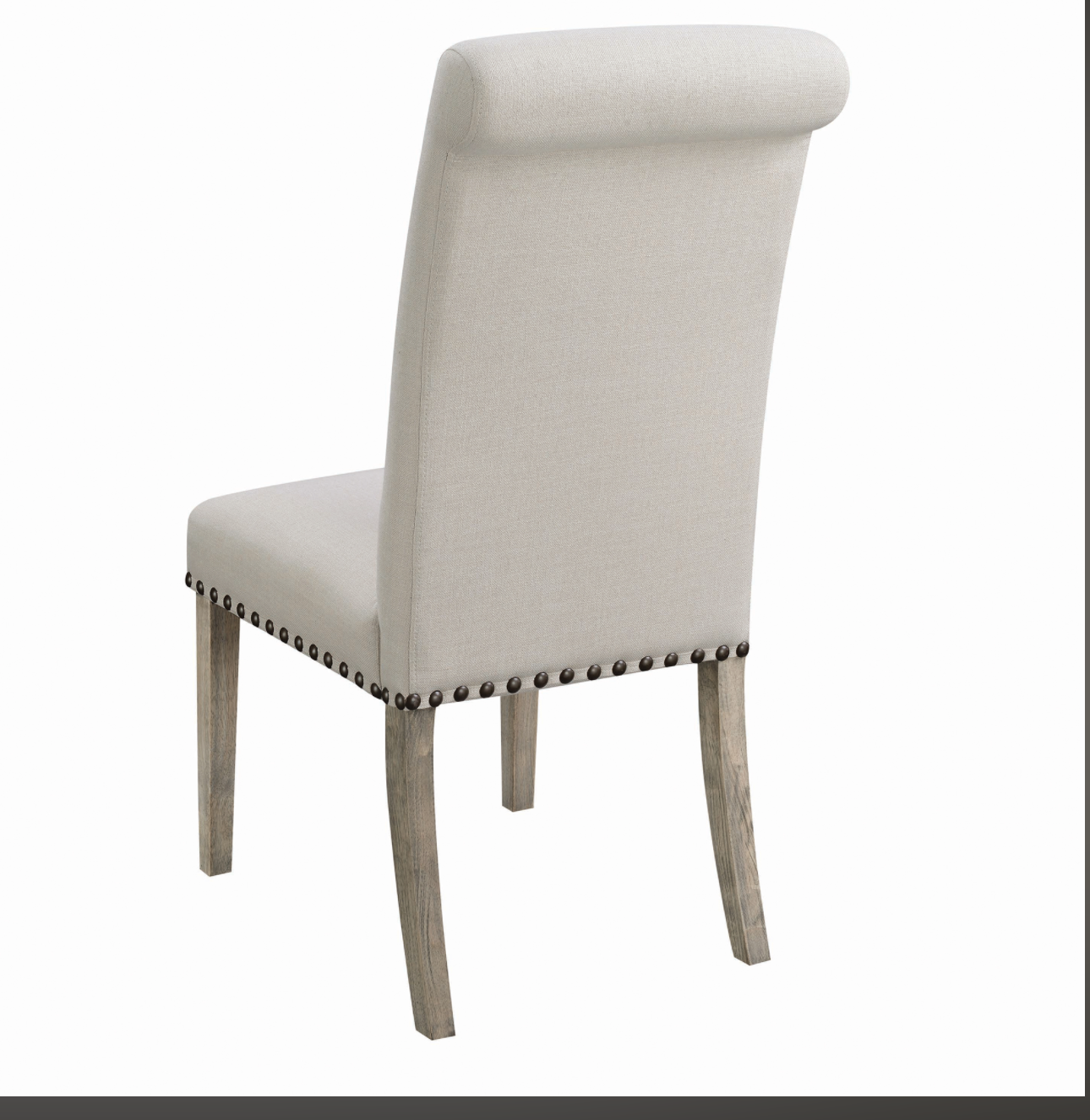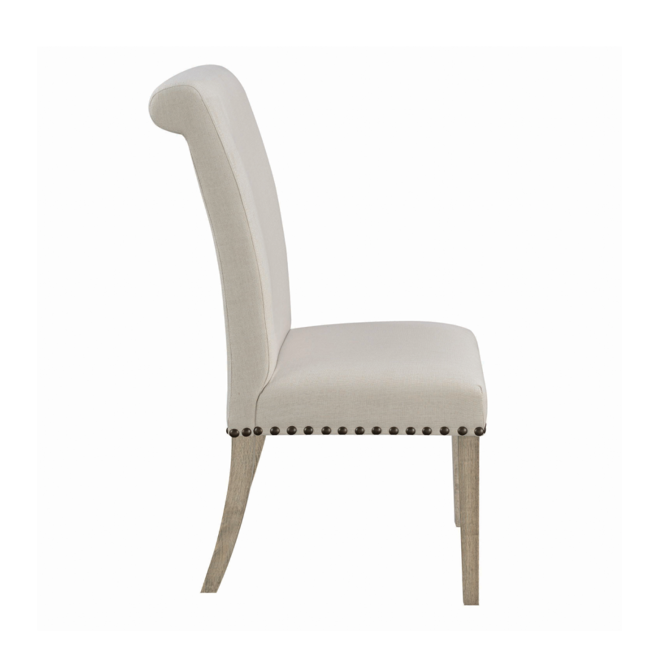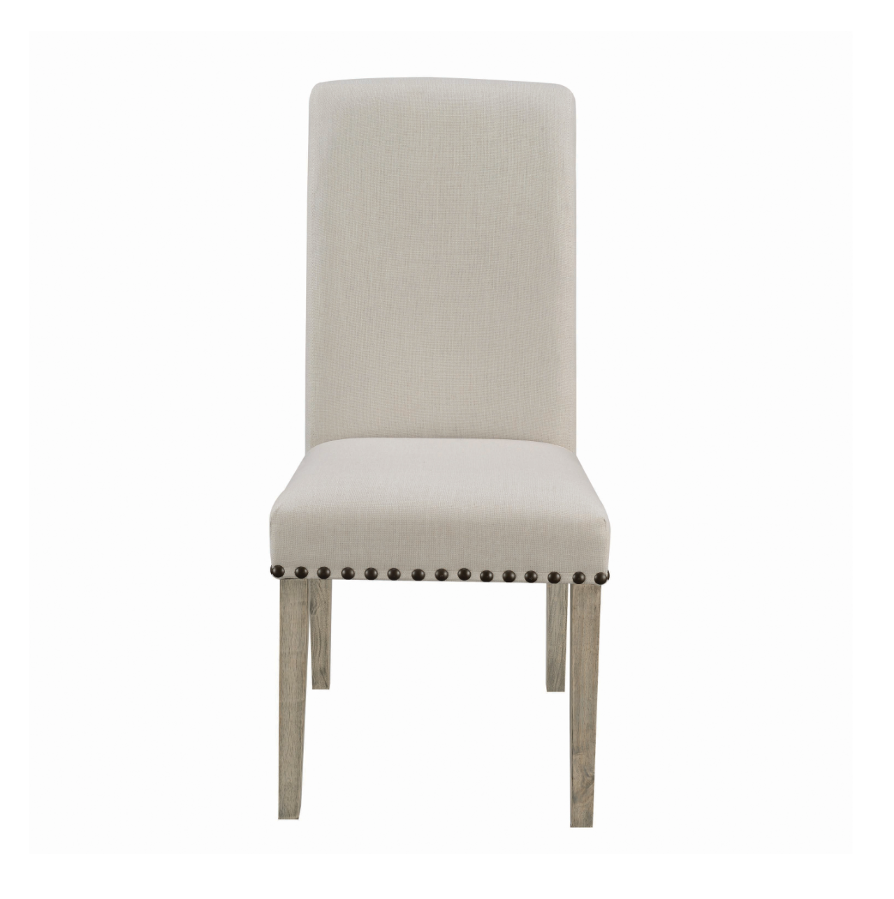 Appreciate the sophisticated look of a tall silhouette with fresh, inspiring style. This dining chair offers a versatile look that blends well with glass, wood, or metal tables. Transitional in motif, it combines invigorating modern touches with classic elements. A neutral upholstered wrap generates light, airy ambiance. Charming nail heads line the bottom of its seat edge, and narrow tapered legs with a neutral finish balance a stylish palette.
