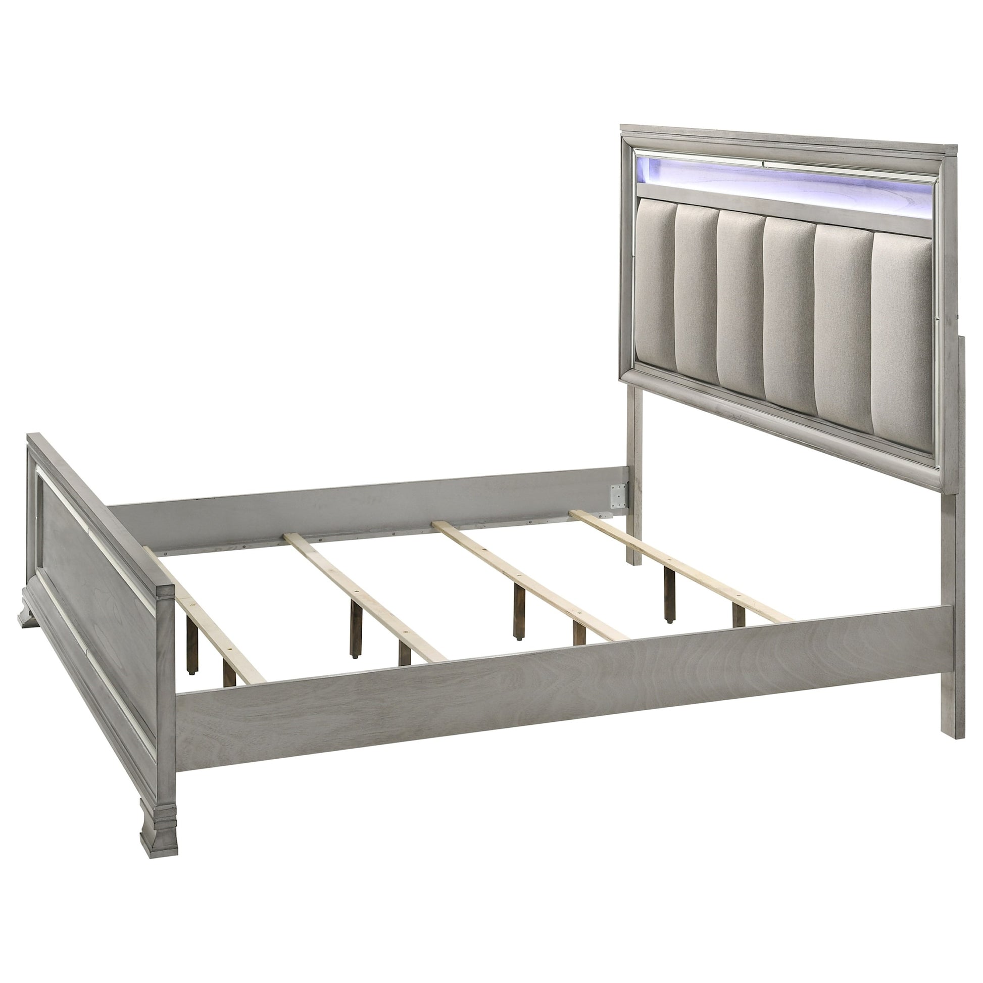 Give your bedroom a showstopping centerpiece with this glam bed. This piece features mirrored accent bordering and a light finish, as well as an upholstered headboard with LED lighting, ensuring your decor is always eye-catching.