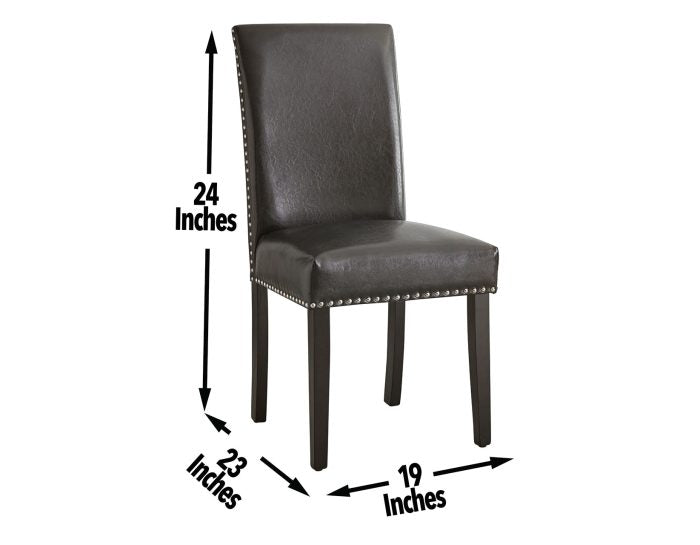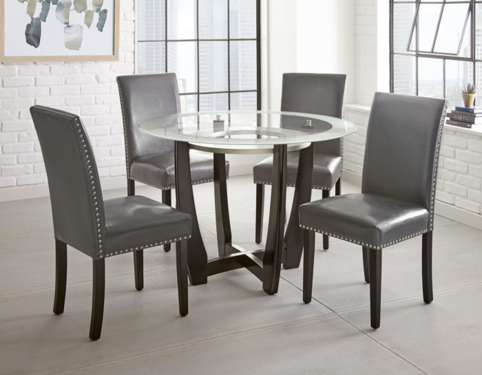 Dine in style with Verano from Steve Silver Company. Nailhead trim Parson’s Chairs shown in black polyurethane make cleanup a breeze and also are available in gray. Whether entertaining, working or dining with family, Verano will spice up any dining area.