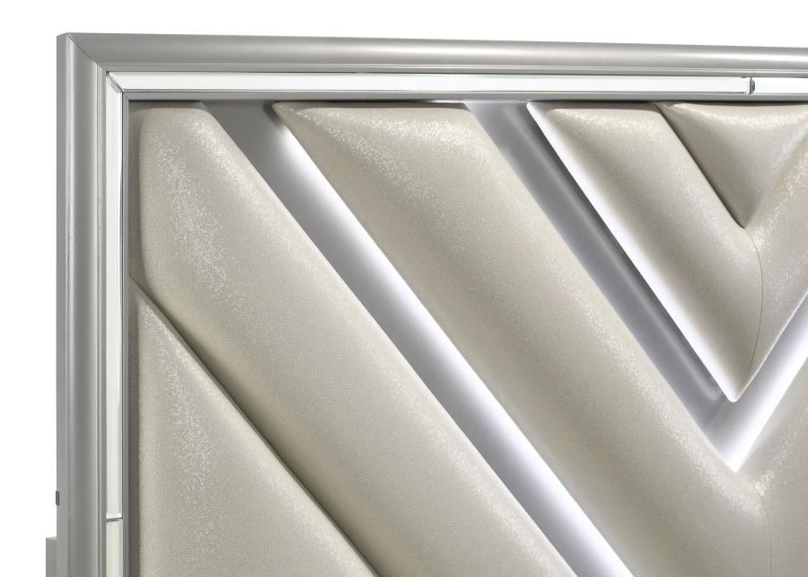 - Chevron upholstered headboard in star white includes LED lighting with a white blue coloration