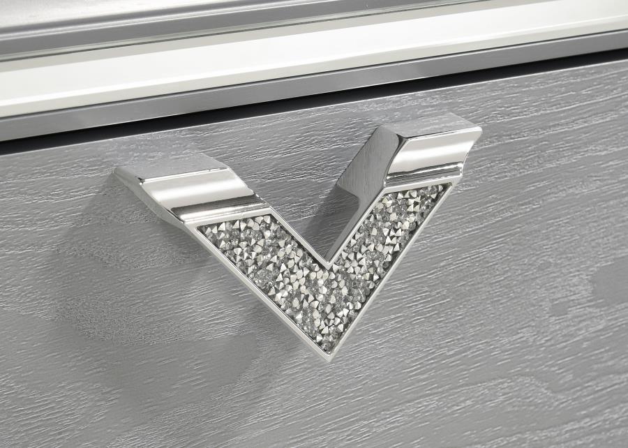 - Each drawer augmented with a glittering, jeweled finish chevron handle that adds sparkle