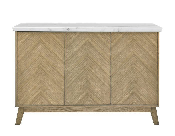 Clean modern lines and a knife edge marble top are the hallmarks of the Vida Marble Top Server. Soft touch doors are free of distracting hardware pieces creating a streamlined profile that allows the burnished blonde finished ash veneers to show through in a striking chevron pattern.