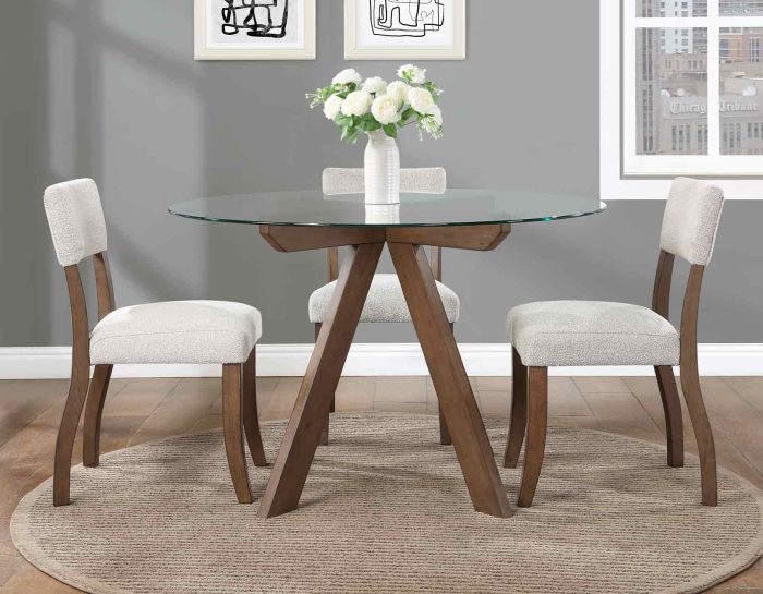Compact dining in a stylish package, the Wade glass top table adds beauty to small area dining. The 48-inch table seats four comfortably and features a hearty timber-beam base finished in a multi-step mocha finish that is displayed wonderfully beneath the tempered glass top. Sparkle, depth and function all combine in a dining package you’ll instantly fall in love with.