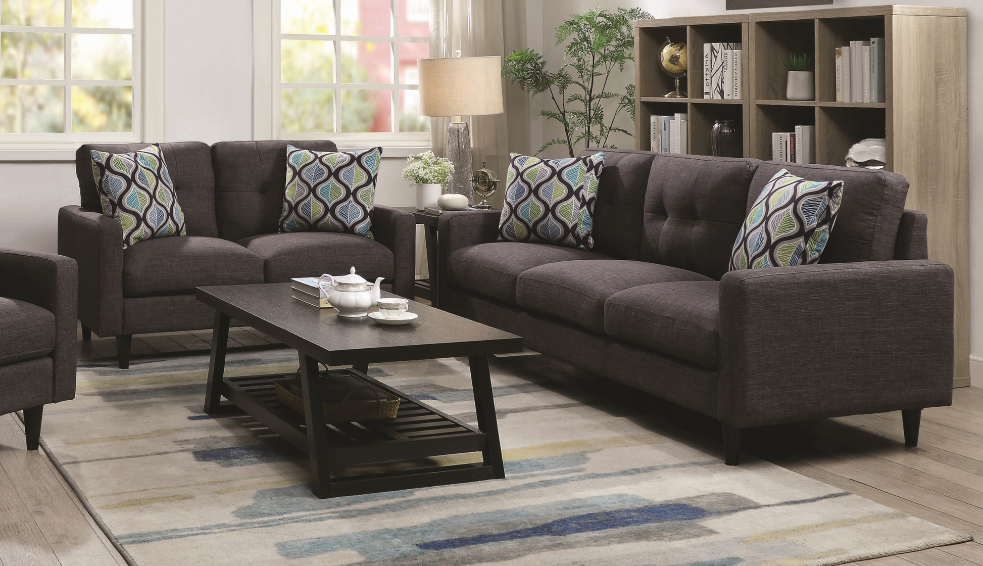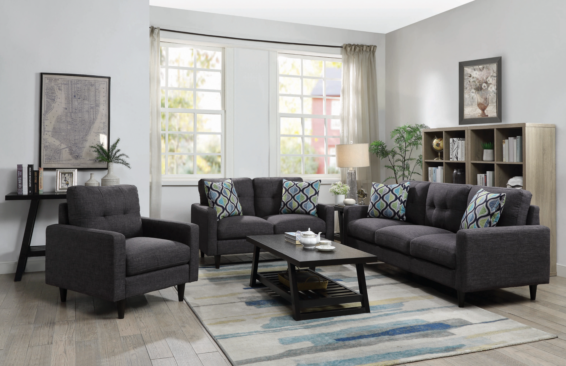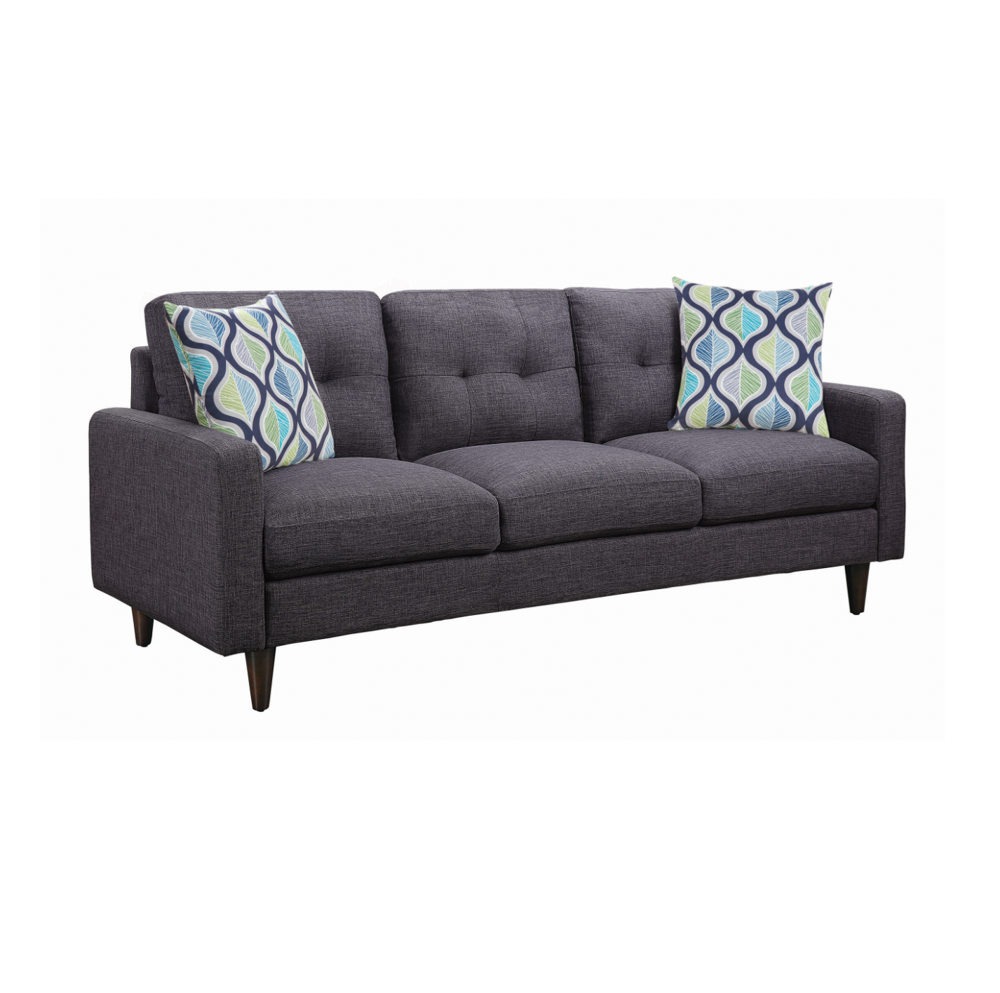 Relax on this stationary sofa that has clean lines and style that's sure to satisfy. Seat cushions are plush for hours of enjoyment watching anything from Netflix to the playoffs. Thick, button-tufted seat backs add timeless style as well as comfort and support. Round tapered legs and wide arm supports impart sturdiness and convenience all in one. Wrapped in dark grey fabric that appeals to even the most discerning homeowner.