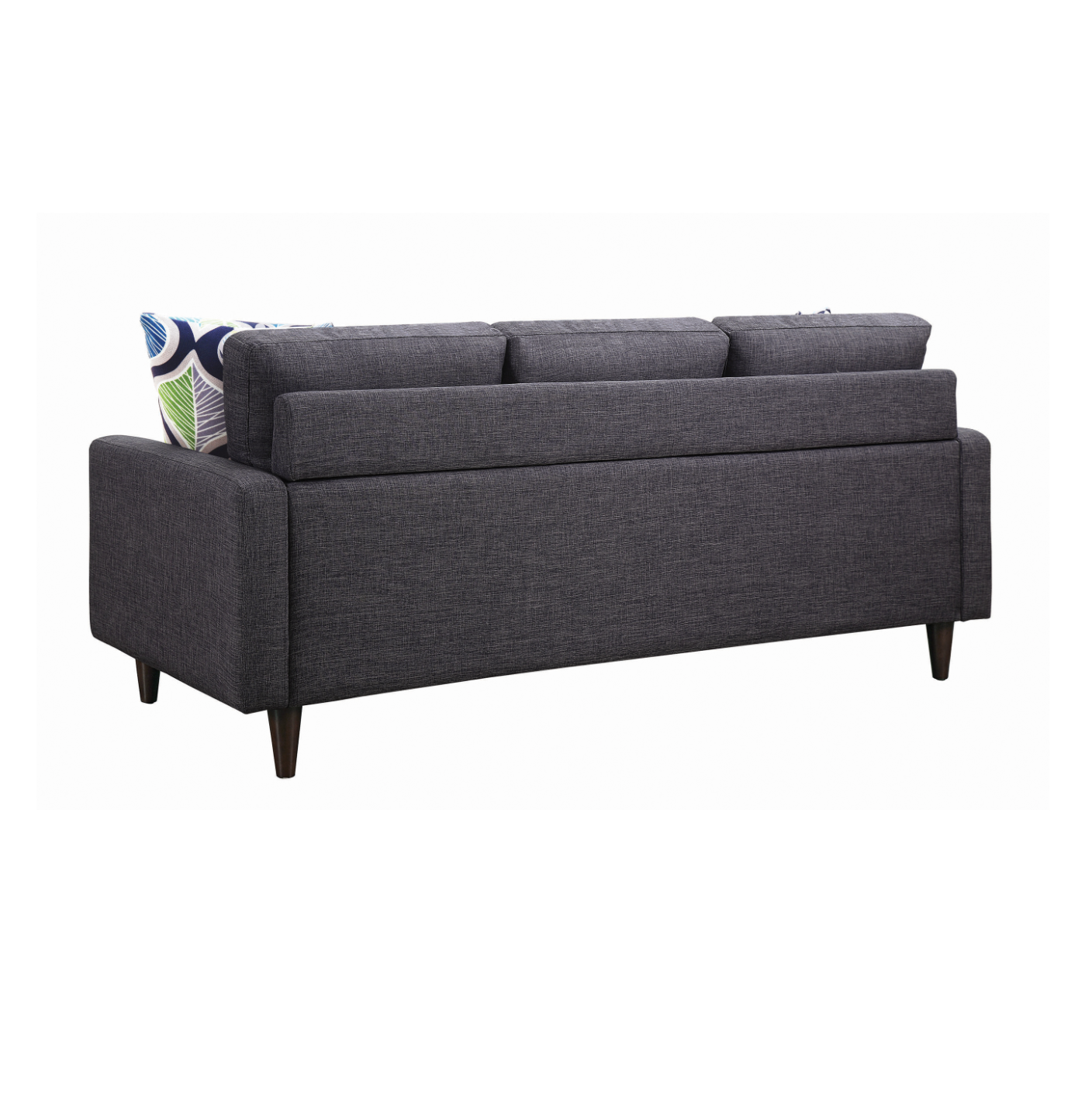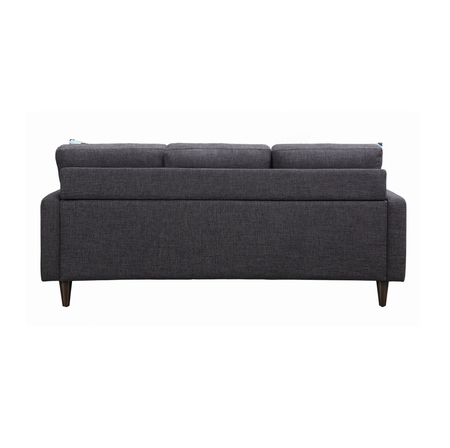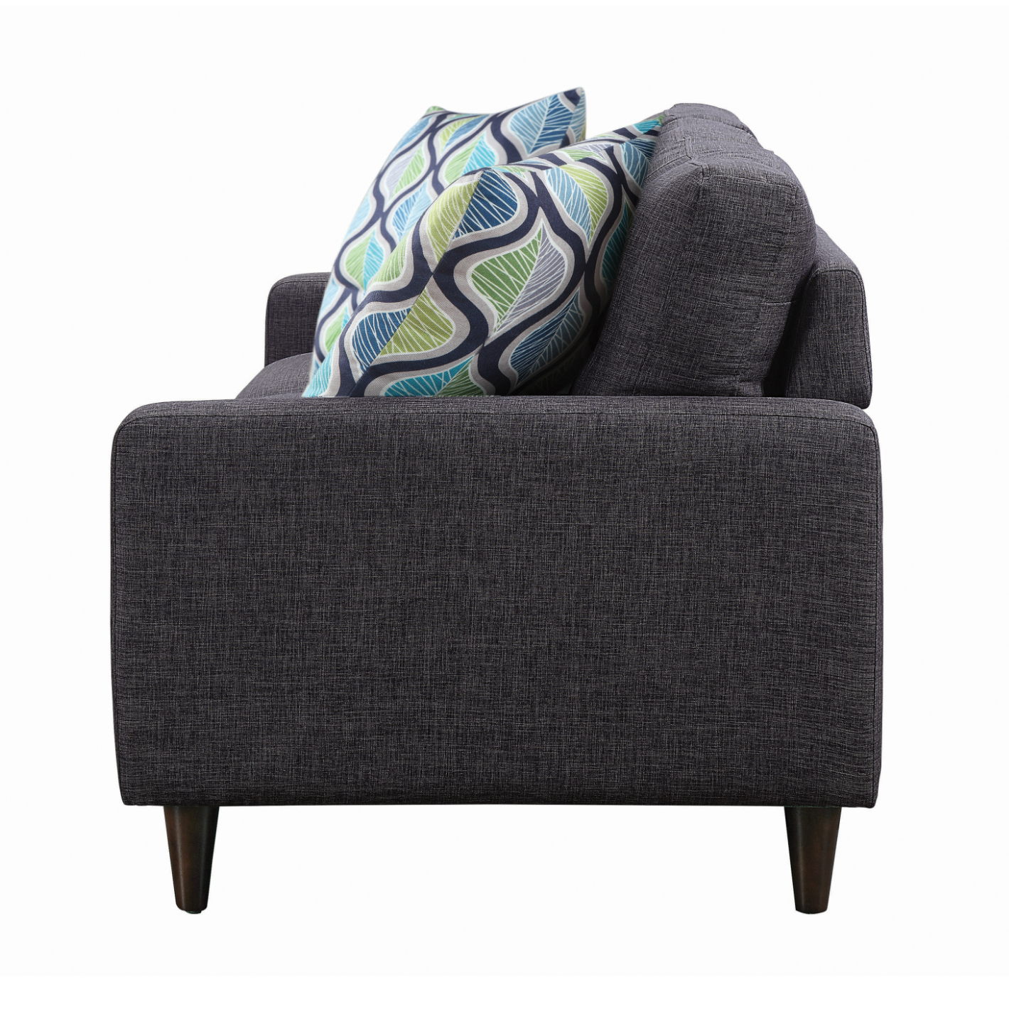 Relax on this stationary sofa that has clean lines and style that's sure to satisfy. Seat cushions are plush for hours of enjoyment watching anything from Netflix to the playoffs. Thick, button-tufted seat backs add timeless style as well as comfort and support. Round tapered legs and wide arm supports impart sturdiness and convenience all in one. Wrapped in dark grey fabric that appeals to even the most discerning homeowner.