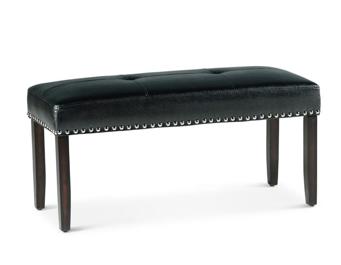 - Styling details include pewter nailhead trim chairs upholstered in easy-care black polyurethane with tapered legs that complement the tapered dining table legs