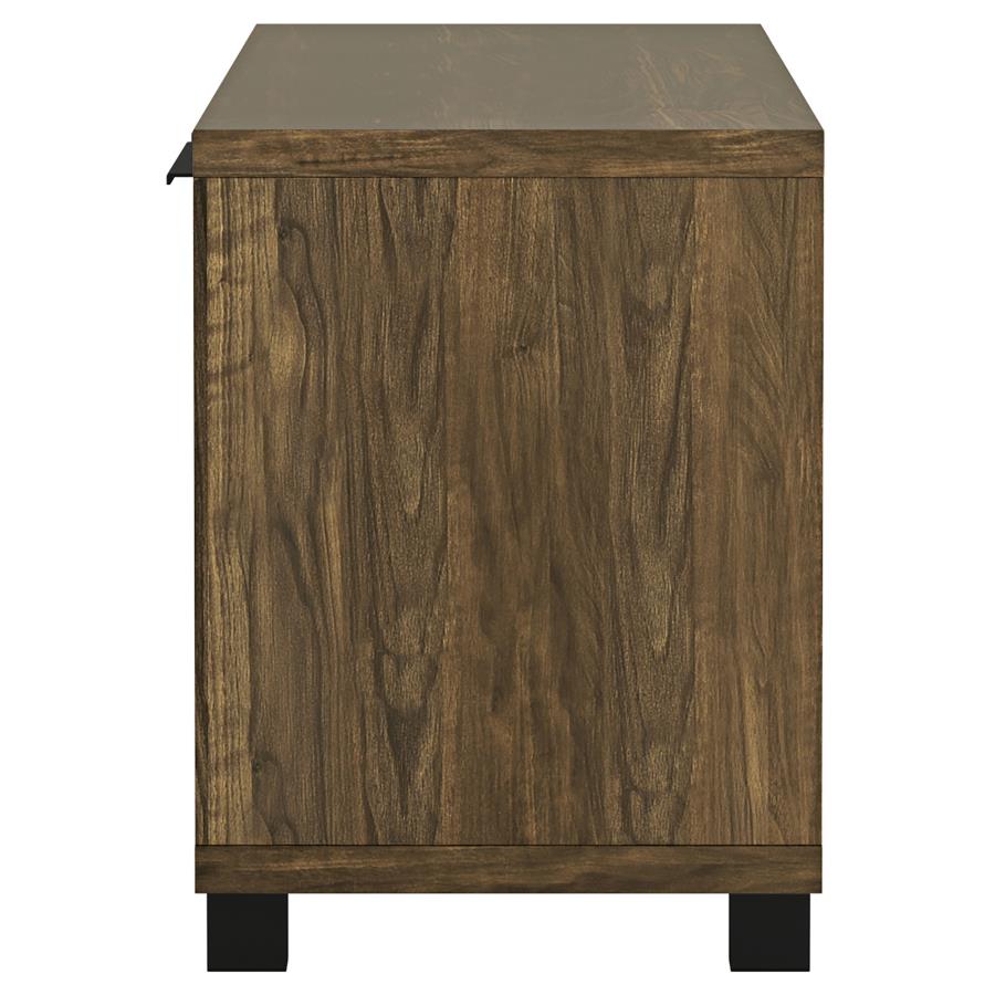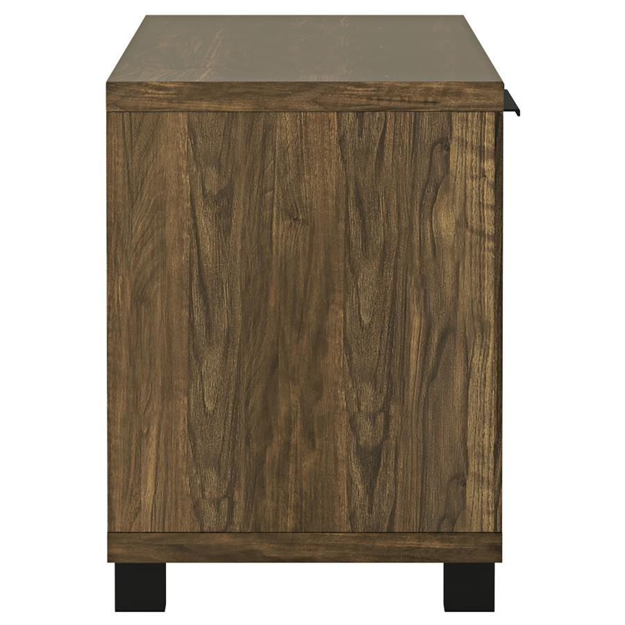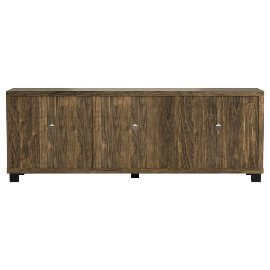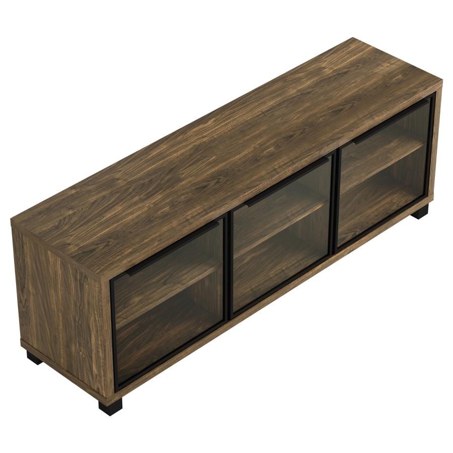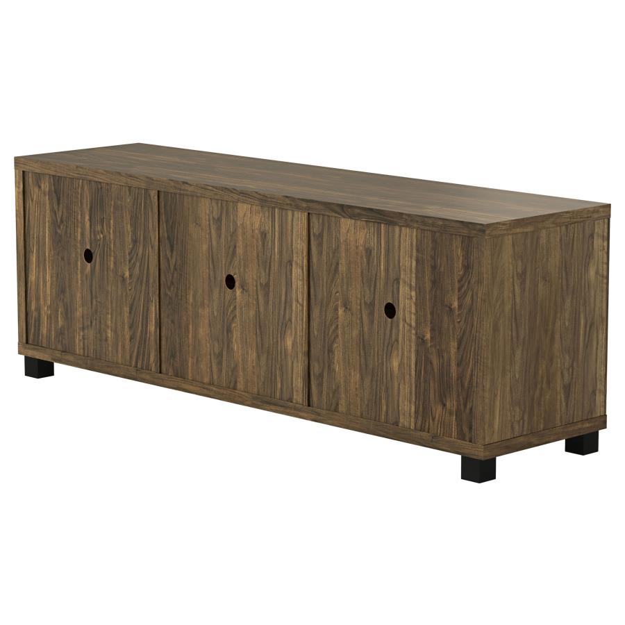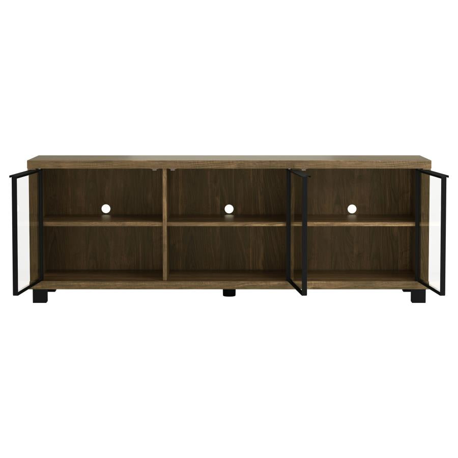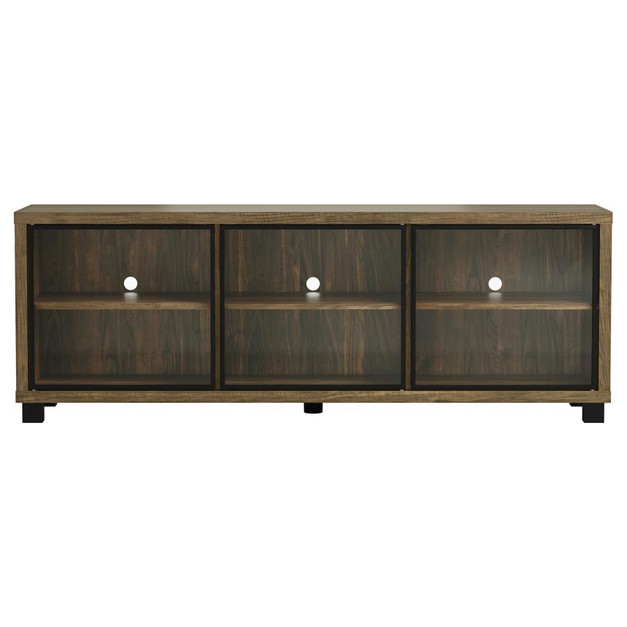 Give your living room a sophisticated upgrade with this beautiful, wooden TV console. This stylish console is equipped with six storage compartments to easily organize your space. An aged walnut finish blends with black metal accents for a classically beautiful look. Natural wood grain designs lend rich, rustic appeal. This transitional TV stand is complete with an expansive surface that fits up to a 64-inch TV.