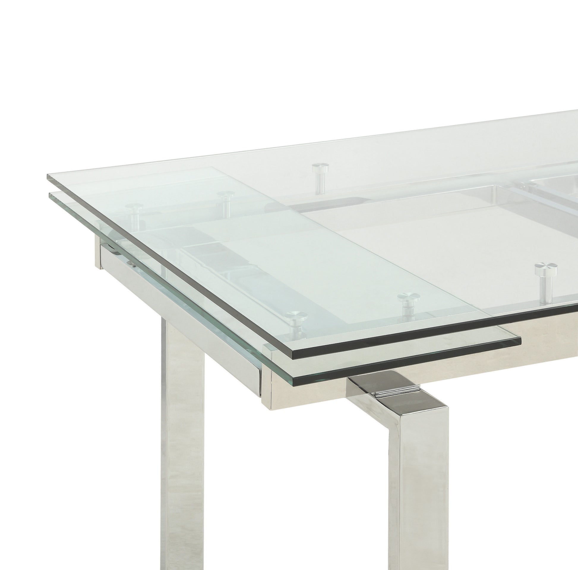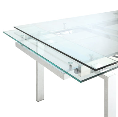 Contemporary design fuses with polish and panache in this dining table from the Wexford collection. This rectangular table has a strong tempered glass table top with stainless steel and polished chrome finish. Table easily fits larger groups with its refractory leaf extensions that add over two feet in length. Pair this sleek table with matching chairs (available separately) for a stunning set. Perfect for a dining room with a view in a contemporary styled home.