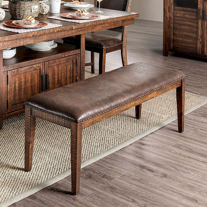 This dining set keeps everyone at the table and comfortably eating dinner. Padded leatherette seating keeps people cozy. A matching server table completes the rustic allure.