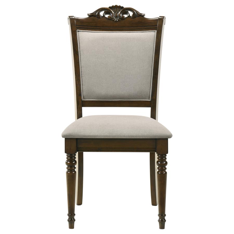Asian hardwood and wood products construction adds warmth to your living space when this wood and fabric seven-piece dining set suits transitional or traditional dining rooms to perfection. Rich chestnut finish wood and gray fabric converge to deliver rustic beauty as four side chairs and two armchairs add a dramatic color and finish palette. With subtle checkered tabletop patterning, you’ll enjoy the full experience of earthy beauty, as chairs offer a slightly rounded back silhouette and share stylish turned accents with the table legs. Sit comfortably on coordinating chairs embellished with a sculpted top emblem and turned leg accents. Soft gray fabric upholstery over foam delivers exquisite comfort for long periods of seating.