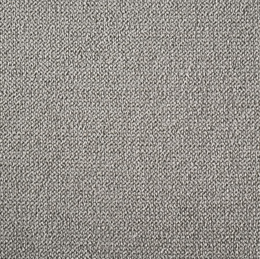- Soft gray fabric upholstery adds piped trim around back inset panel and over padded seat cushions