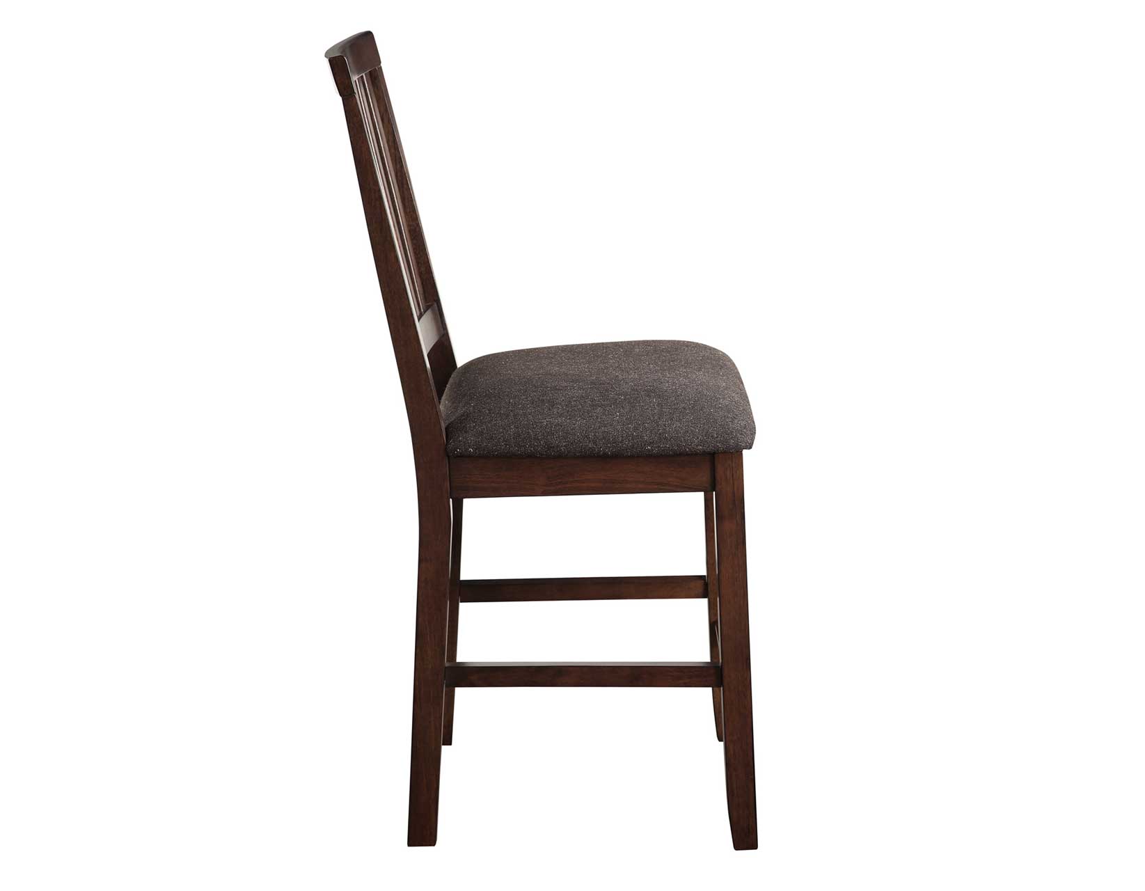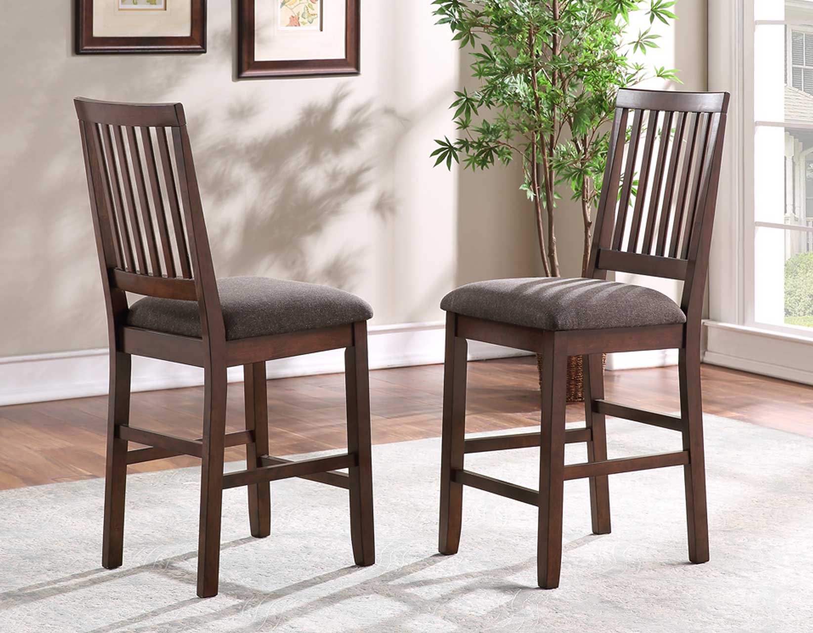 Transitionally styled with mid-century modern influences, Yorktown features a lustrous espresso finish over mindi veneers that is both cozy and functional. Solid wood chairs are upholstered in a modern gray tweed for a comfortable seat and feature vertical slat backs and tapered legs that complement the tapered legs of the table.