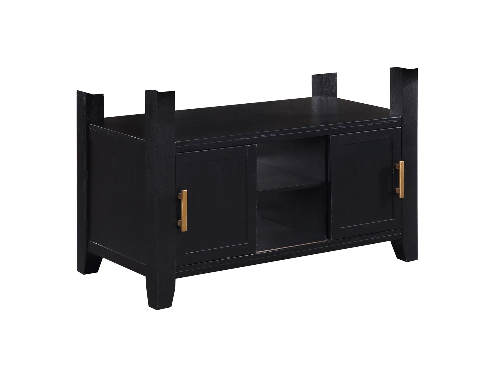 - Three storage cubbies underneath the shelf- one open, two covered with sliding doors on each side
