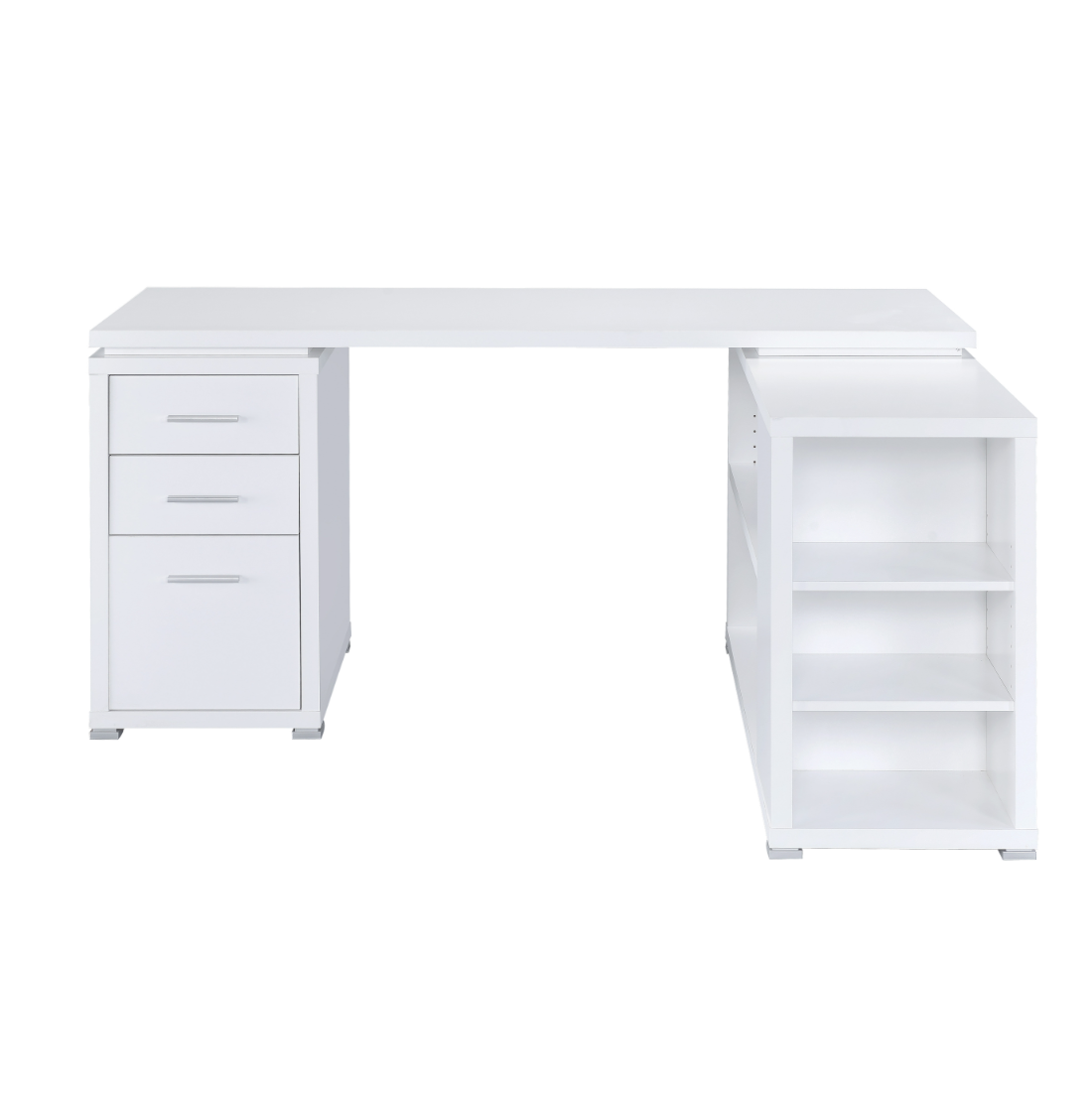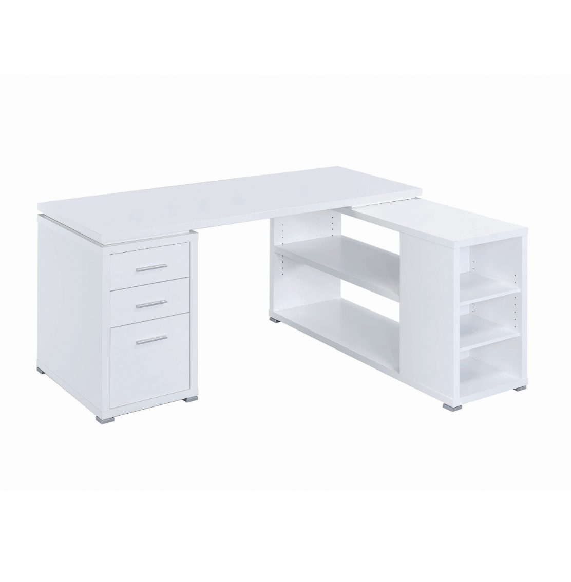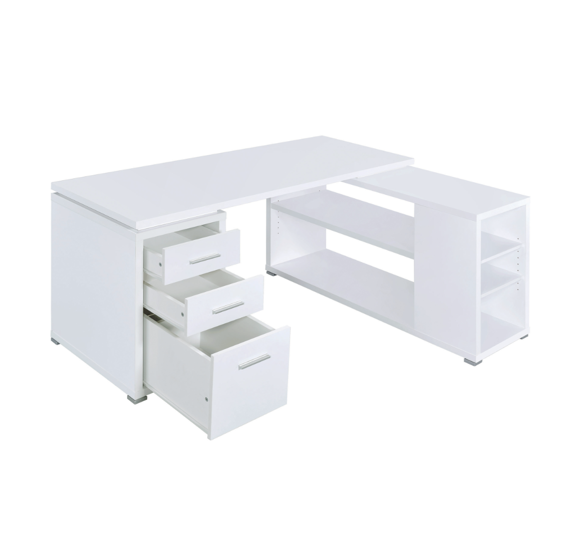 This attractive office desk makes it easy to stay organized. With a variety of drawers and shelves, it provides lots of storage space for computer accessories, office supplies, and more. Its built-in file cabinet can hold legal size files, helping you keep your documents neat and tidy. Its large L shape promotes productivity with ample surface space to spread out. The sleek, no-nonsense design of this desk is accentuated by a lovely white finish.