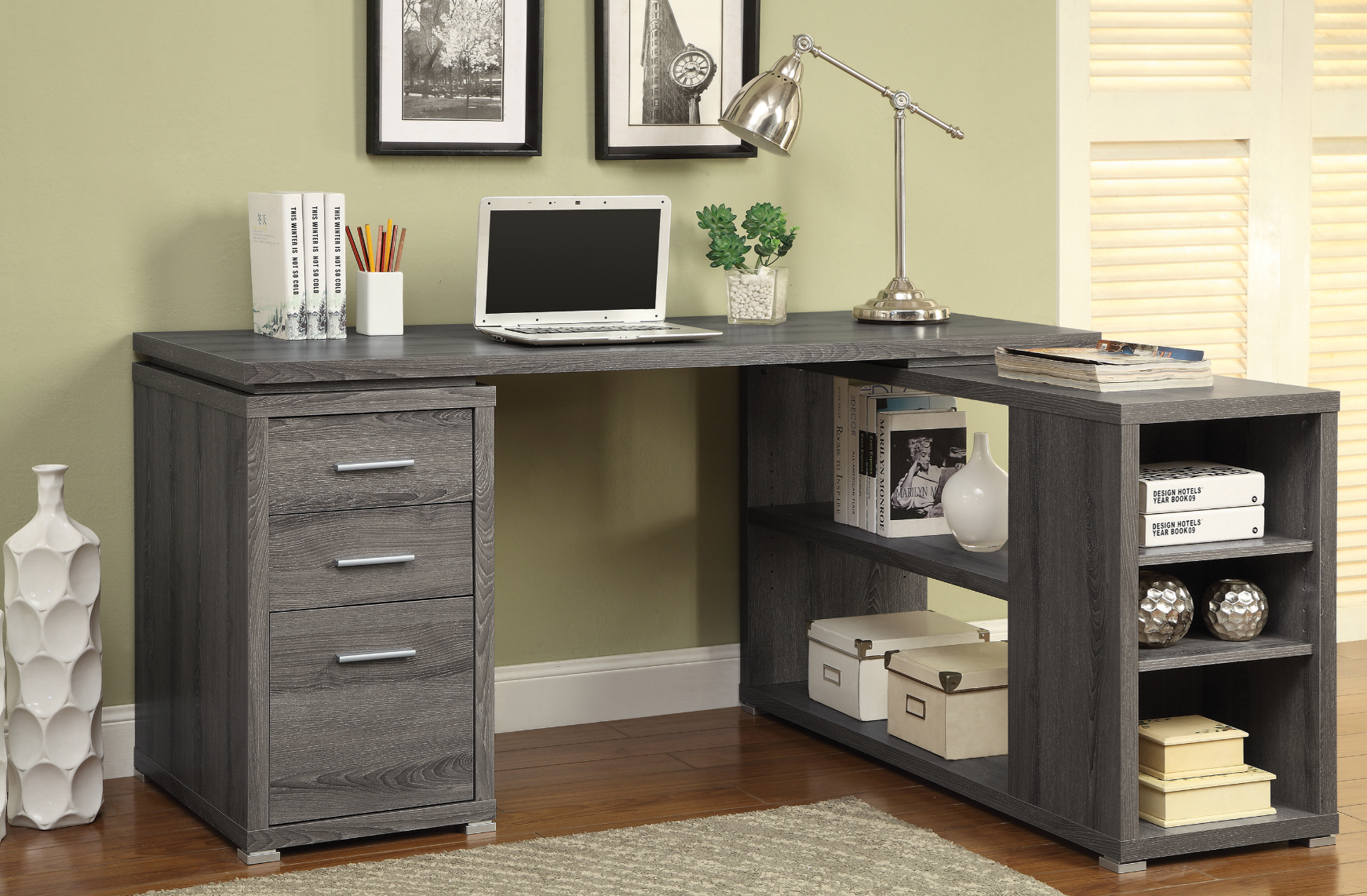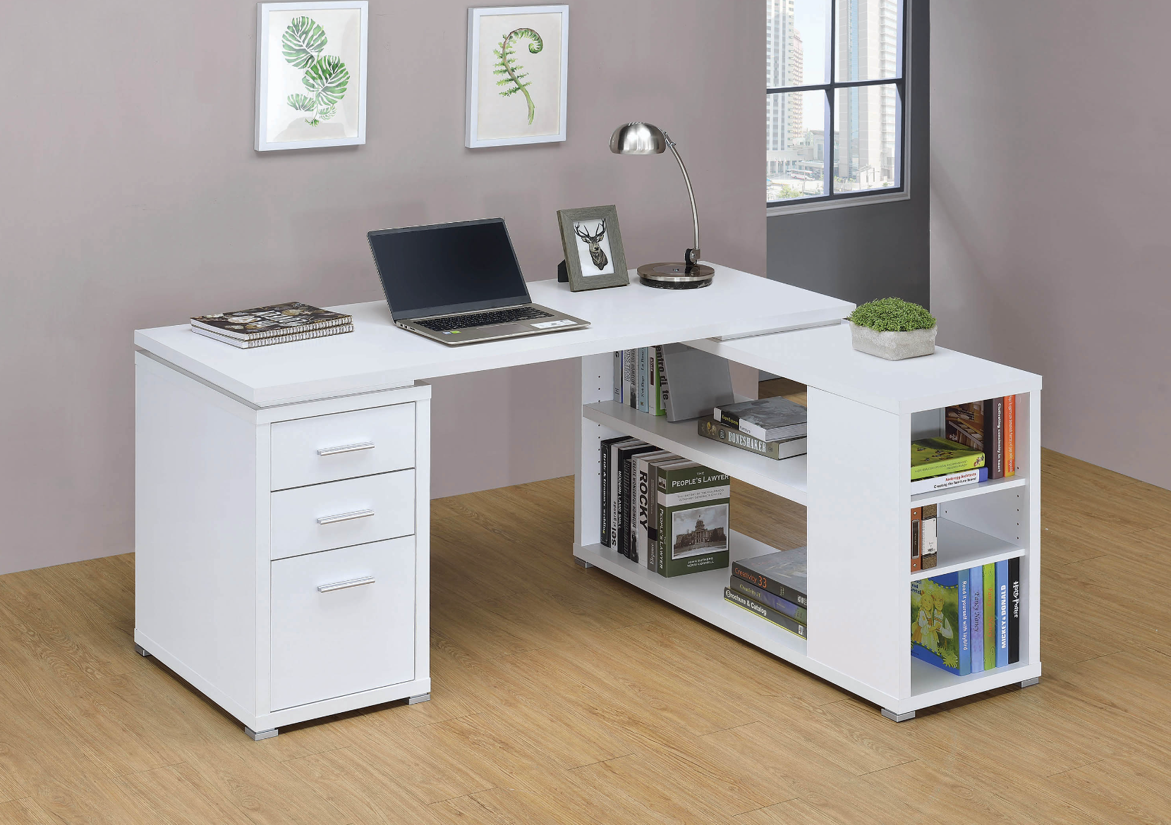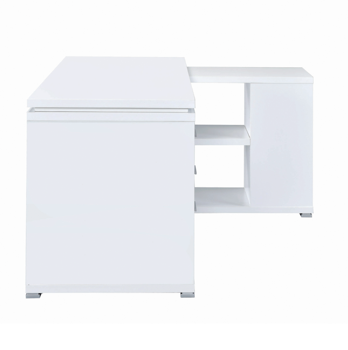 This attractive office desk makes it easy to stay organized. With a variety of drawers and shelves, it provides lots of storage space for computer accessories, office supplies, and more. Its built-in file cabinet can hold legal size files, helping you keep your documents neat and tidy. Its large L shape promotes productivity with ample surface space to spread out. The sleek, no-nonsense design of this desk is accentuated by a lovely white finish.