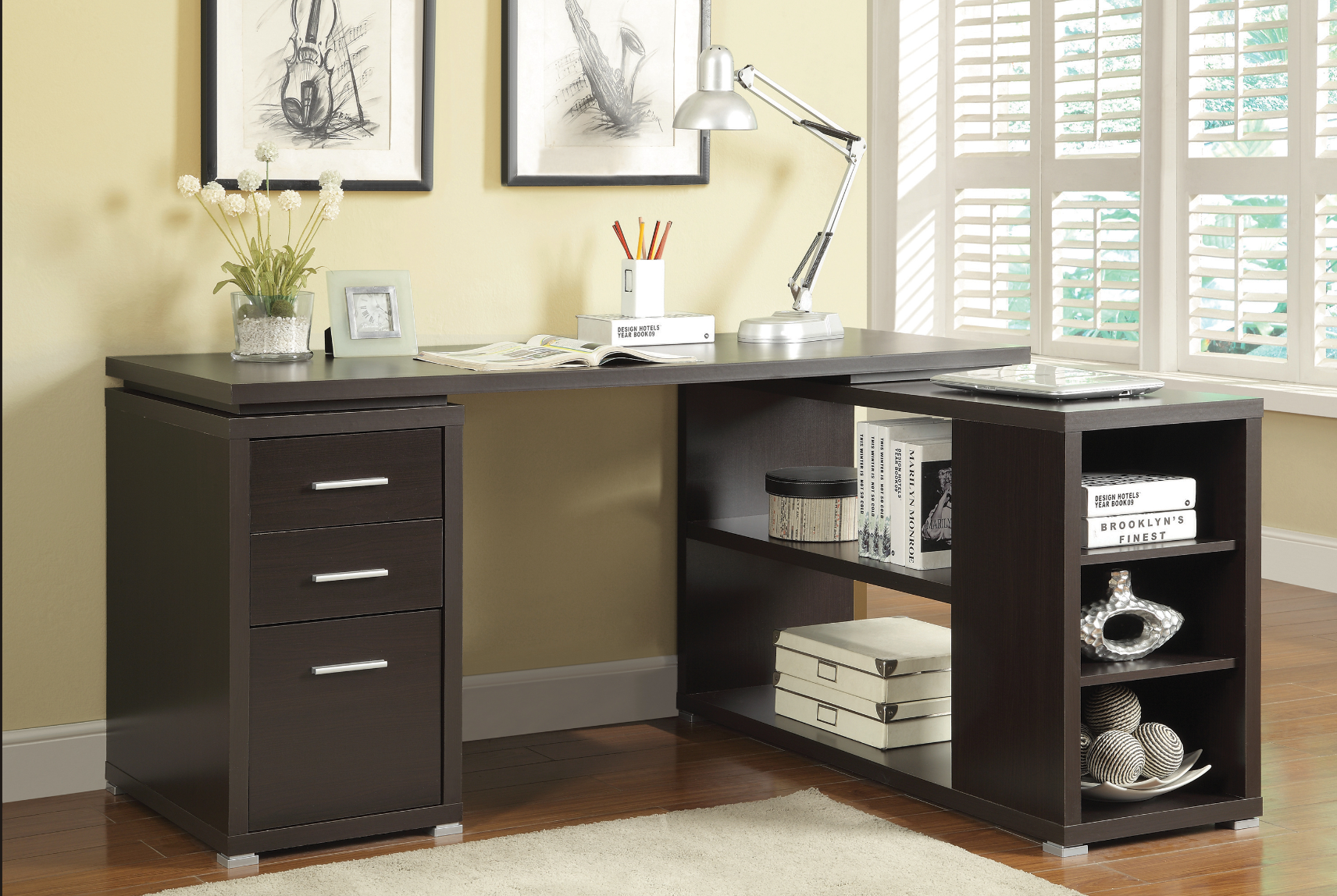- Features multiple storage options including two drawers and a file cabinet