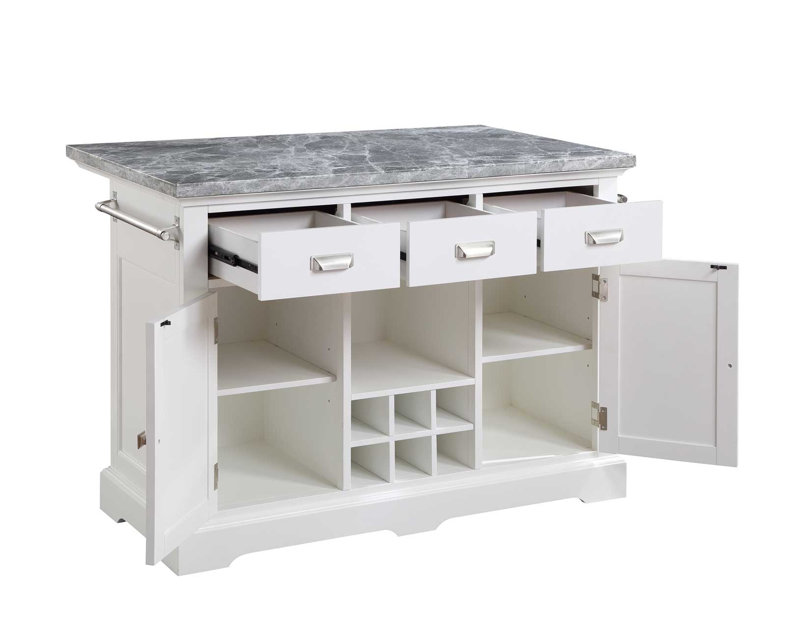 Add seating and storage to your kitchen with the Zermatt Grey Marble Top Kitchen Island. Clean classic lines with the beveled door panels, bracket feet and nickel cup hardware pulls create a warm and inviting gathering piece. The white base and grey marble top offer a neutral palette to go with the many features including dual towel holders, bottle storage rack, hanging stemware rack and overhang shelf for counter seating.